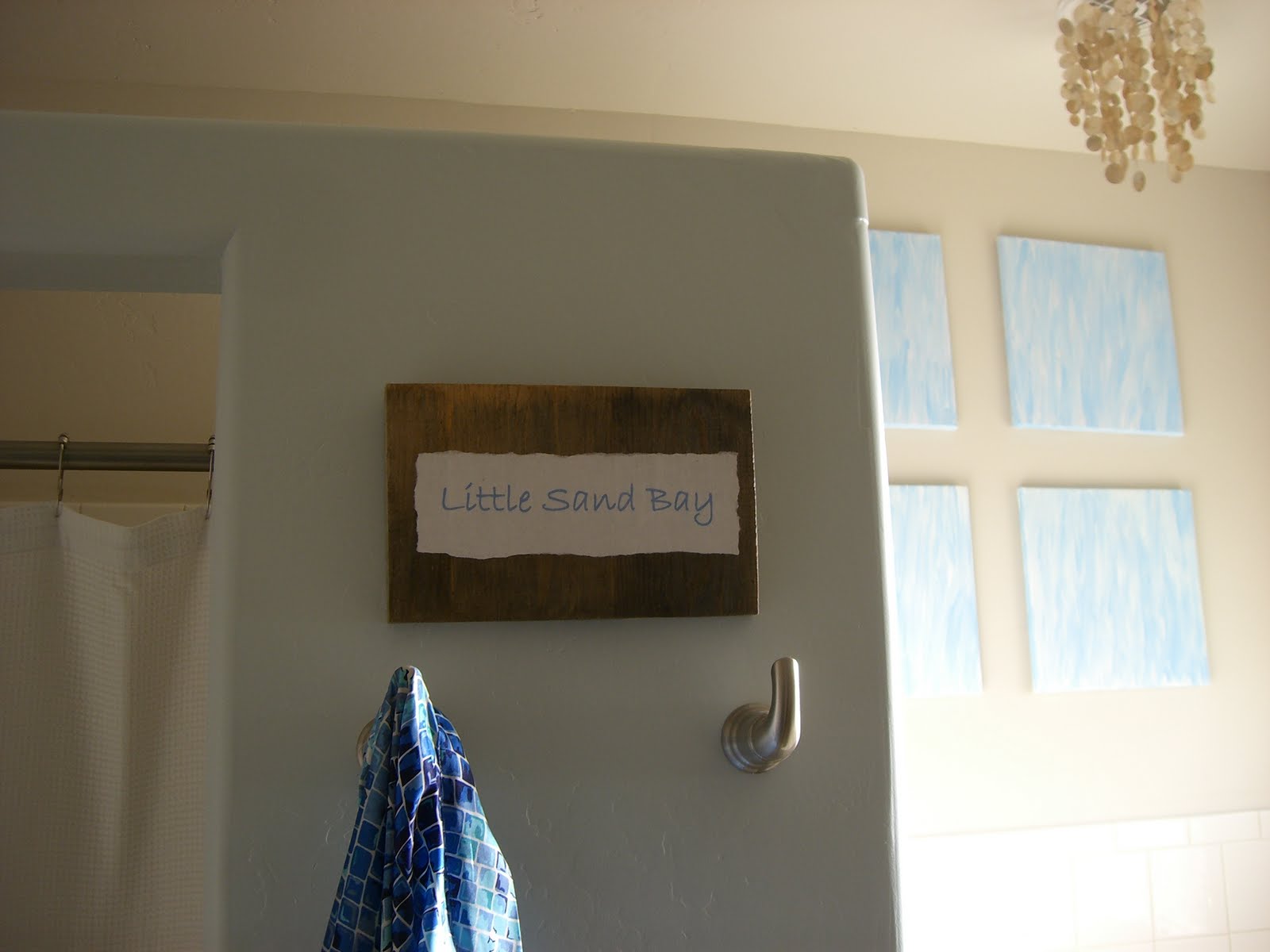 Having hung a photo on one wall above my tub, the other wall was calling out for some artwork. Using four discounted square canvases, small bottles of blue and white acrylic paint, and a paint brush, I made some DIY artwork.